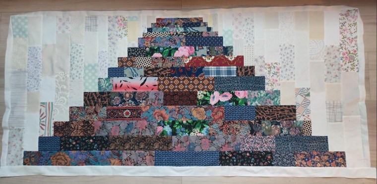 J’avais encore des restes, mais pas assez, j’ai donc complété avec quelques tissus neufs, et je me suis lancée dans un demi-motif des « Marches du palais ».