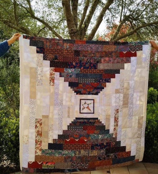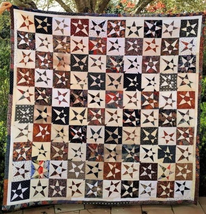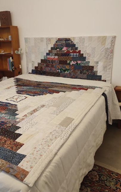 Vous vous souvenez peut-être de l’ouvrage que j’avais cousu pour mon père, avec les tissus récupérés dans l’armoire de couture de ma mère décédée, avec quelques vêtements également utilisés. Un quilt de mémoire qui a profondément touché mon père. Ce fut un projet plein de défis personnels mais aussi, les tissus bien dépareillés ne facilitaient pas le travail, il faut bien se l’avouer ! La séparation nette entre valeurs claires et foncées m’a permis de créer ce plaid double-face avec un bloc unique en Marches du Palais d’un côté, et des étoiles en coupe rapide de l’autre. Voici les deux faces, des détails dans l’article par ici :