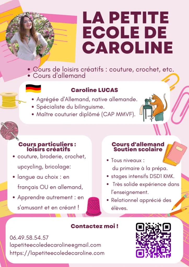 Aujourd’hui, nous passons un peu de temps avec Caroline (une autre Caroline que notre hôtesse, mais de la même génération) qui a créé sa petite structure éducative polyvalente. Beaucoup de personnes s’engagent pour dispenser des cours de couture pour adultes, bien moins pour enfants, mais rares sont les ateliers proposés en deux langues !