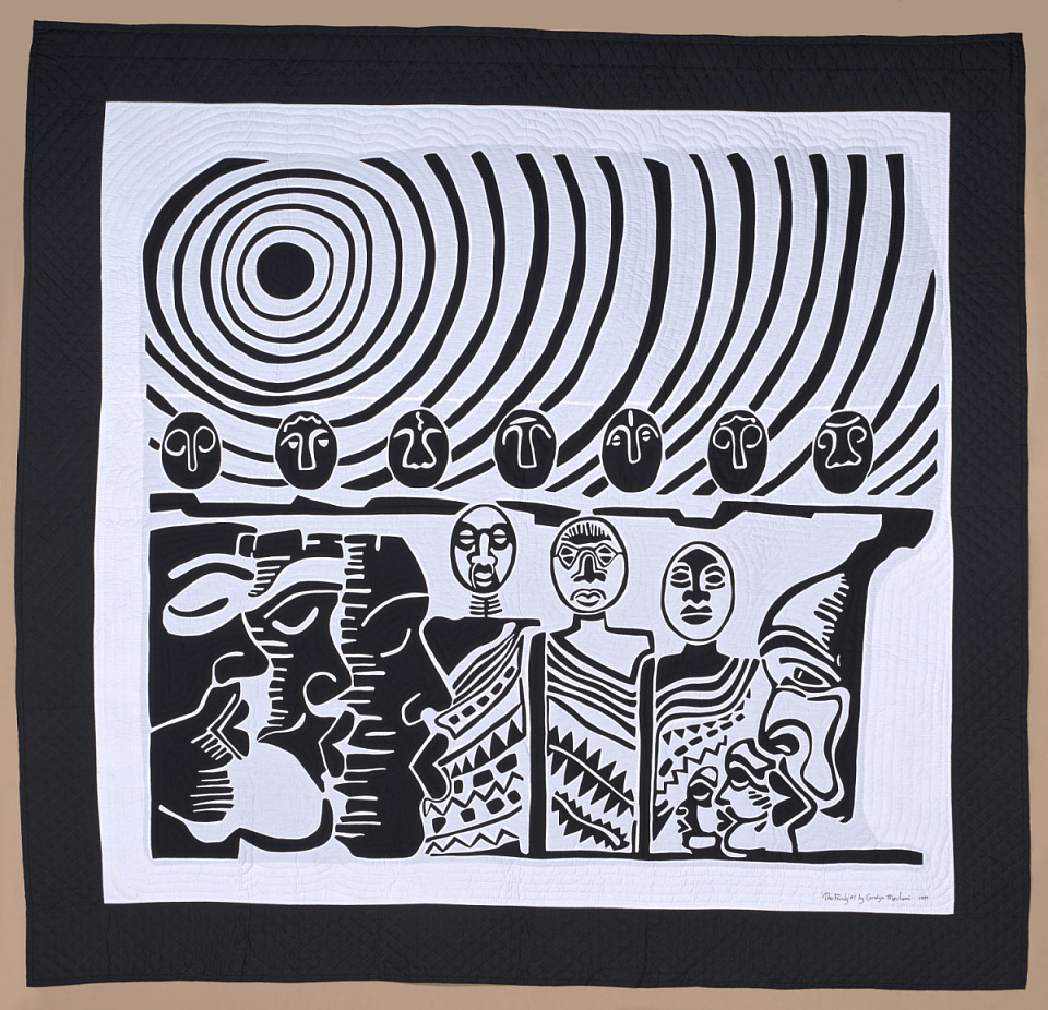 Ce quilt, fait en appliqué inversé, célèbre ses ancêtres africains en tant qu’intermédiaires entre la Terre et le Cosmos. Une oeuvre graphique remarquable !