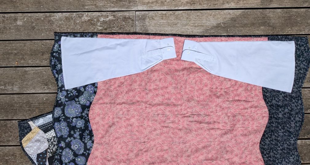 Un manchon est un tunnel, dans lequel on peut glisser une baguette afin d’accrocher votre ouvrage en lui donnant du maintien. Cela s’appelle sleeve en anglais, littéralement la manche. Nous sommes dans le même registre, et pour bien illustrer ce vocabulaire, Kristine a pris les manches de la chemise de son mari pour en faire le manchon du quilt Underground Railroad – Le Chemin de Fer Souterrain :