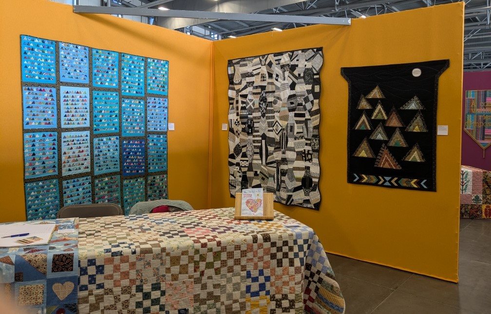 A l’invitation de Carol Veillon, j’ai eu la chance de présenter à Nantes des quilts personnels et de la Ruche des Quilteuses, que vous pouvez retrouver, avec toutes les explications, dans mon livre Sacrés Tissus. Quelle joie ! Notre galerie était d’un beau jaune safran, qui mettait en valeur nos quilts de manière chaleureuse.