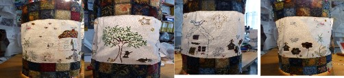 1 paquet de charmes ( une trentaine de carrés de 6 X 6 cm) et quelques restes de tissus assortis pour des sujets appliqués.