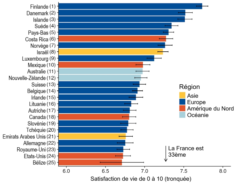 C’est un classement international, le World Happiness Report, mesurant de nombreux critères comme le PIB par personne, l’espérance de vie en bonne santé, la cohésion sociale, la qualité du système éducatif, mais aussi la confiance entre les citoyens (justice juste et efficace – respect des autres), et un certain état d’esprit : la bienveillance envers son prochain.