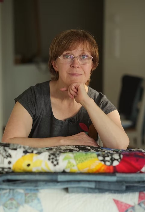 Irina est bien connue en Europe pour ses stages en Finlande, en Allemagne et en France. Curieusement, nous avons beaucoup de points communs, comme celui d’avoir appris par nous-même à partir de livres et magazines pour ma part, par les blogs pour elle. Apprendre par soi-même, c’est faire des erreurs, en tirer des conséquences, et trouver ce qui nous plaît vraiment au travers de multiples réflexions, et savoir ensuite bien expliquer comment faire. Irina a commencé à se passionner pour le patchwork en 2014, après avoir fait de brillantes études (doctorat de chimie) et des enfants. Elle travaille toujours à plein temps et ses loisirs sont dominés par le patchwork moderne, elle qui vit dans l’environnement de l’esthétique scandinave avec ses lignes claires et pures, ses couleurs vives. Elle est aussi concernée par le recyclage des tissus et la satisfaction apportée par cette éthique. Et comme moi, elle est fan du travail à la machine à coudre, mais apprécie faire des parties de quilt à la main, quilting, appliqué et broderie, quand cela s’y prête.