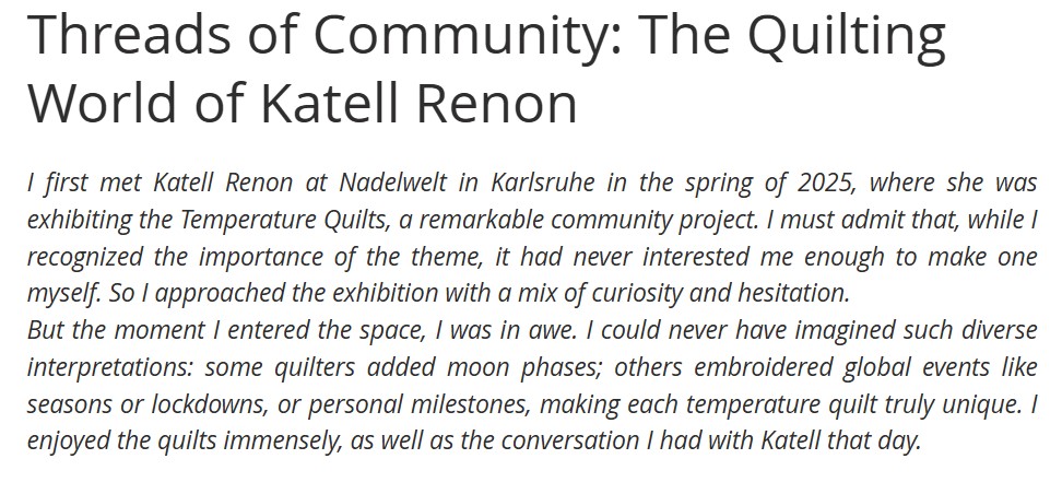 Le deuxième article de cette série d’interviews m’est donc consacré. C’est d’ailleurs Léna qui m’avait présentée à Irina lors de l’exposition des quilts-météo à Karlsruhe. Small world! Ma présentation par Irina Malyukova, publiée hier, est par ici : Threads of Community: The Quilting World of Katell Renon. C’est en anglais, mais on vous propose une traduction instantanée la plupart du temps.