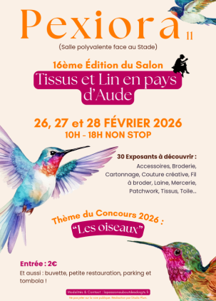 N’oubliez pas, les 26, 27 & 28 février à Pexiora (à mi-chemin entre Toulouse et Carcassonne), le Salon si agréable et sympathique, 16e édition déjà (https://lapassionauboutdesdoigts.fr/) :