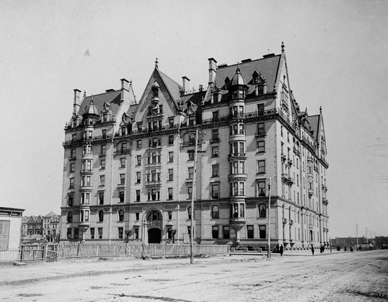 La fortune de la société Singer laissa des traces à Manhattan. Edward Clark, en investisseur avisé, fit construire le Dakota Building, dans un endroit encore en friche, au Sud-Ouest de Central Park. Y vécurent nombre de personnes mondialement connues. Mention particulière pour John Lennon qui y vivait et fut assassiné en rentrant chez lui, le 8 décembre 1980. Voici ci-dessous le Dakota building tout juste construit entre 1880 et 1884. Son architecture néo-germanique, son agencement à la Française, ses 65 appartements de 4 à 20 chambres, avec chauffage central et électricité produite sur place, sa large porte cochère pour faire passer chevaux et calèches, en firent un des bâtiments les plus inspirants, un grand immeuble à la mode !