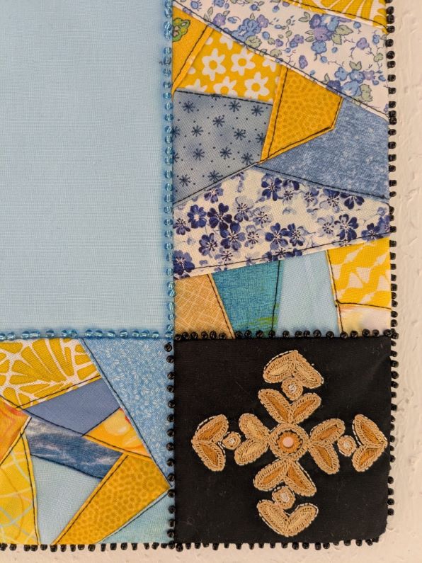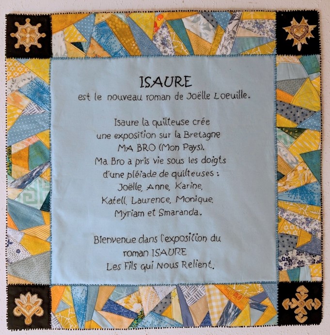 C’est une affiche qui explique cette initiative inédite : créer l’exposition d’une héroïne de roman, et collaborer avec la romancière pour que chaque quilt soit bien intégré au narratif. Nous toutes, Anne, Karine, Laurence, Monique, Myriam et moi avons joué le jeu, avec Joëlle Loeuille l’écrivaine. Quant à Smaranda, elle nous offrira pour Nantes un quilt résumant l’amitié des trois amies dans le tome 1, PATCHWORKS.