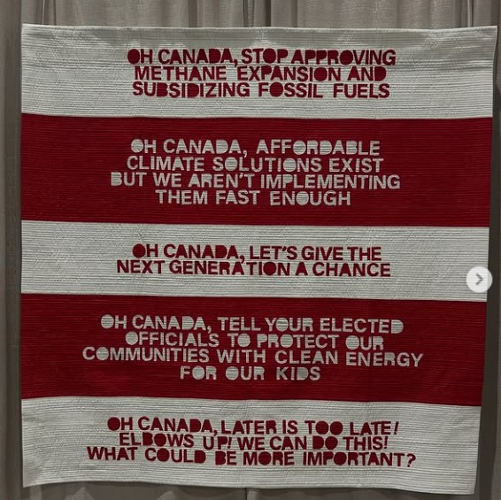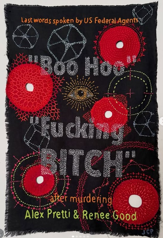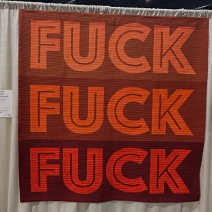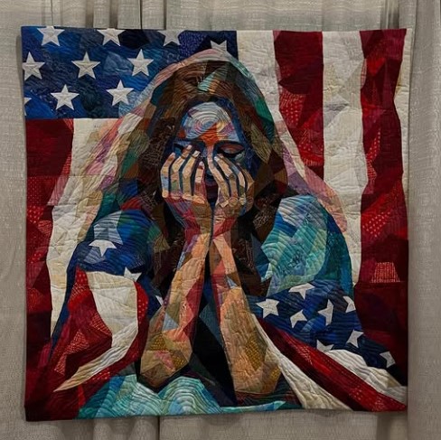 Ci-dessous, vous avez quelques exemples de quilts « activistes » parmi les dizaines exposés la semaine dernière au QuiltCon 26 à Raleigh : un manifeste contre l’ensemble de l’année 2025, avec Trump clairement visé (Audrey Esarey), un tableau où l’Amérique pleure (Maritza Soto), un manifeste contre les horribles violences récentes dans le Minnesota (Judy Coates Perez) et un appel à l’action pour maîtriser le changement climatique au Canada (Kristen Andrews).