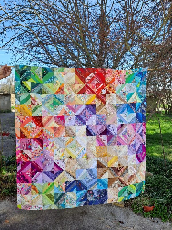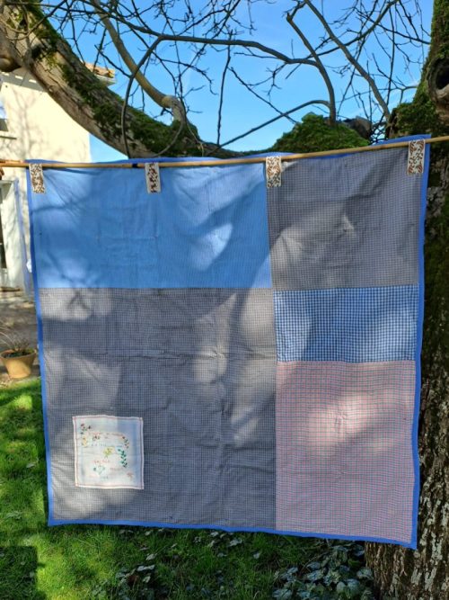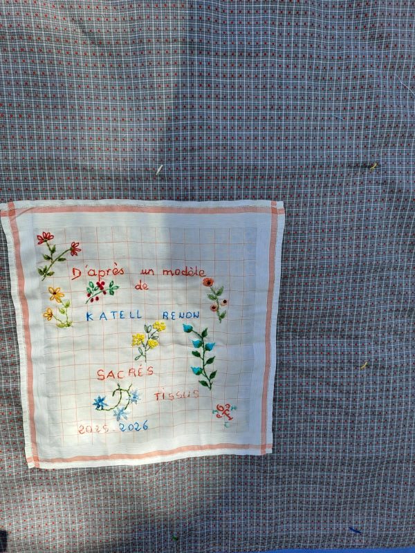 Marie-Hélène a eu la gentillesse de faire une étiquette informative ET très belle, toute brodée : je suis toujours sensible aux belles finitions, même au dos ! Mais il manque tout de même le principal, le nom de Marie-Hélène ne figure que très discrètement avec les initiales…