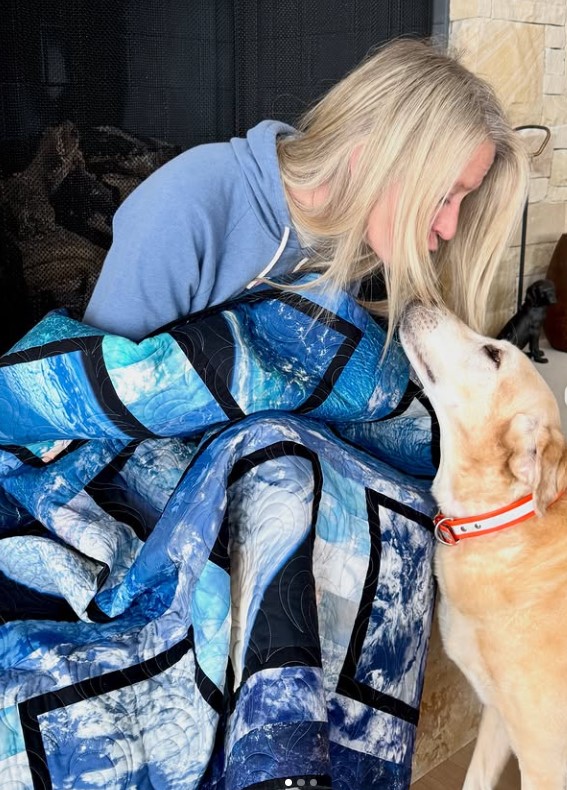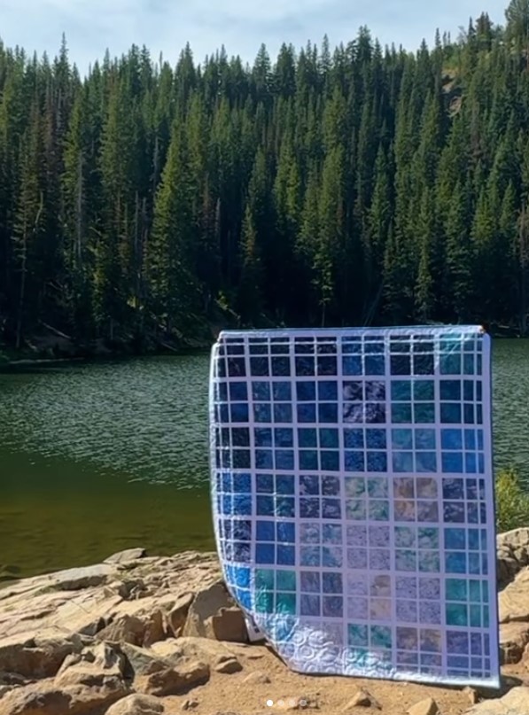 Vous vous doutez que Karen avait pris des milliers de photos de la Terre vue de l’ISS. Elle a eu la bonne idée de proposer à la firme de tissus Robert Kaufman d’en faire des imprimés pour des quilts nouveaux. Elle en est à sa deuxième série.