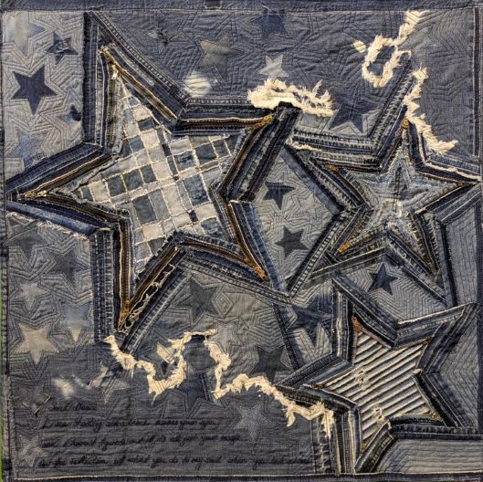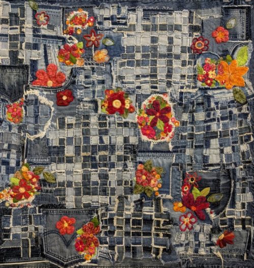 Chez Elisabeth Dubbelde, artiste australienne, la récup du jean fait du bien. Faire du beau et de l’expressif avec ce que d’autres jetteraient, quelle satisfaction !