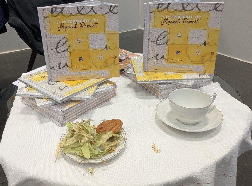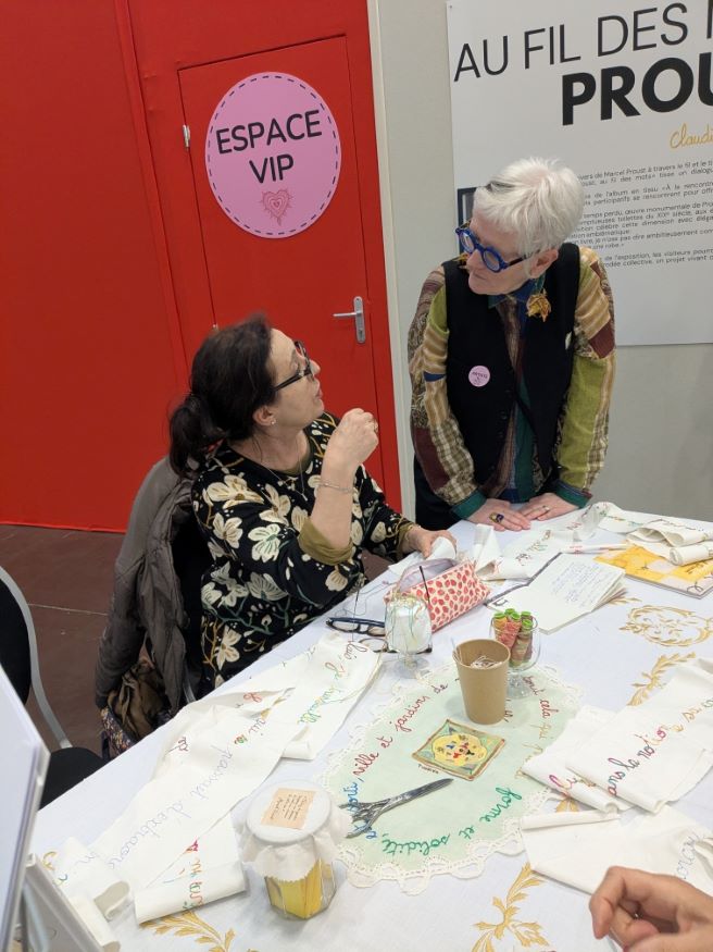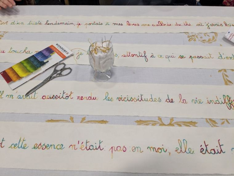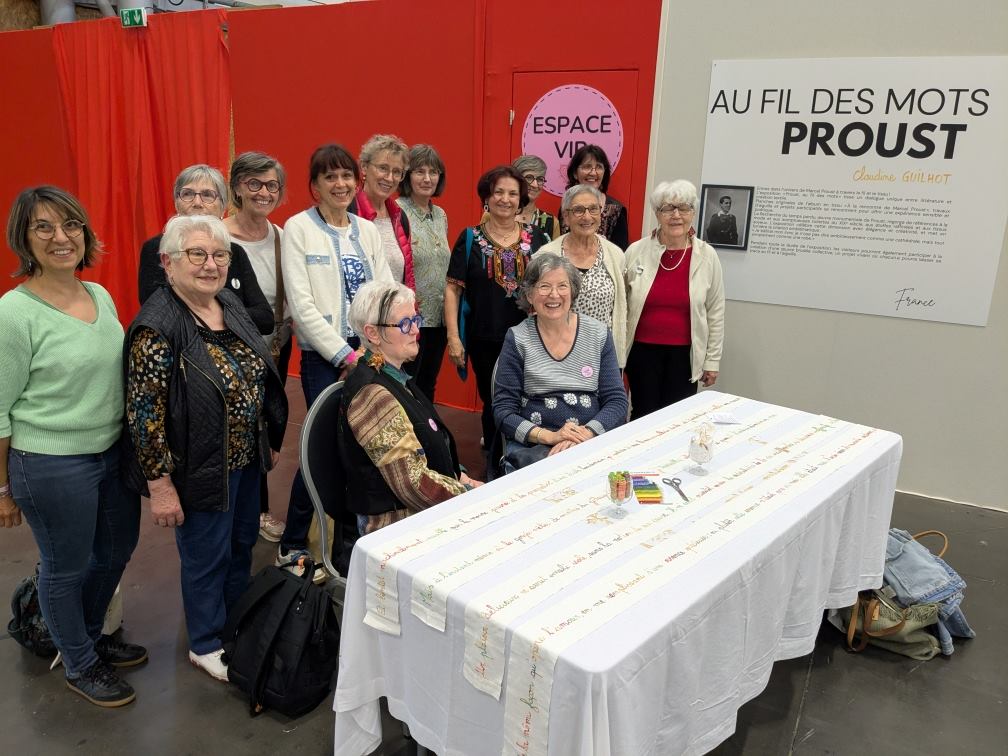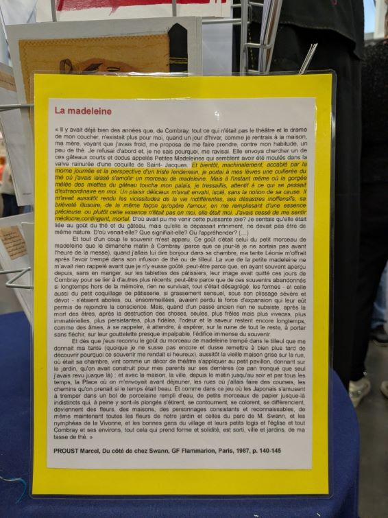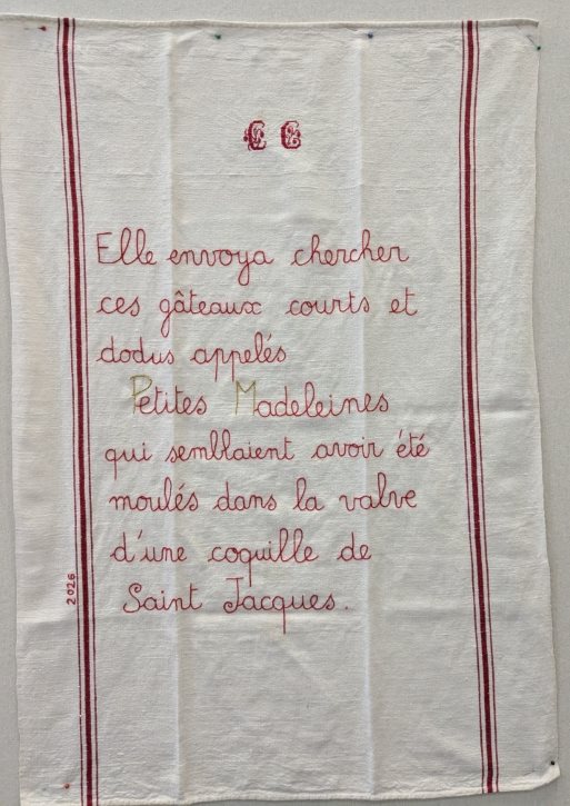 Outre la qualité de l’évocation de Marcel Proust, Claudine a eu l’excellente idée de proposer un travail participatif en incitant chaque personne intéressée à broder une lettre, un mot d’un paragraphe de Proust. Pas n’importe lequel ! Celui que tout le monde connaît, celui de la madeleine qui, trempée dans le thé, fait remonter involontairement un souvenir précis et nostalgique de son enfance. Cet épisode est devenu le symbole de toute réminiscence de ce type, une sensation qui fait resurgir un souvenir qu’on croyait oublié.