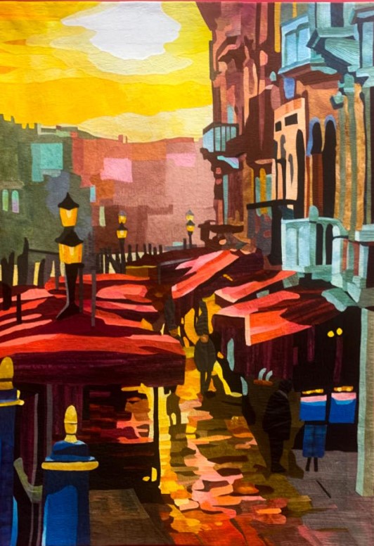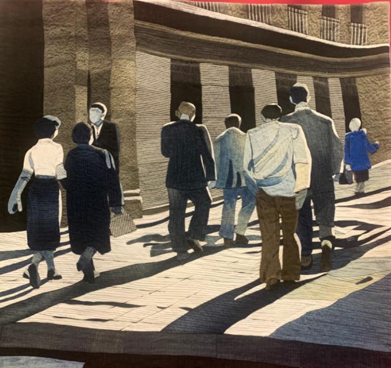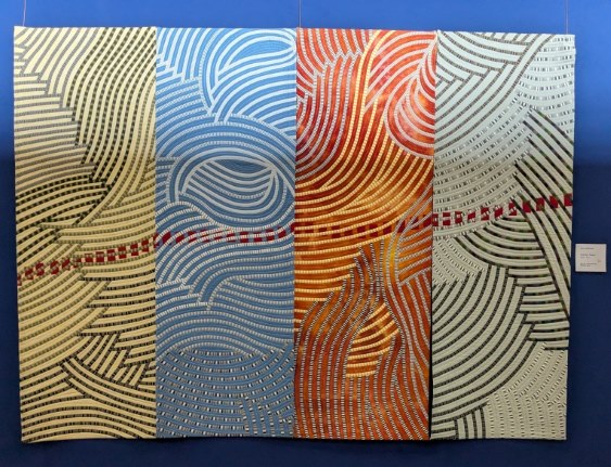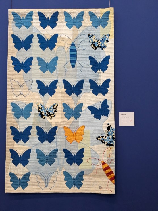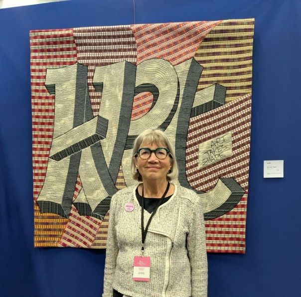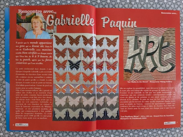 Gabrielle Paquin n’est pas toujours où on l’attend. Beaucoup la connaissent comme membre des groupes les plus exigeants en matière de quilts traditionnels – Quilts de Légende, Quilts en Rêve – mais peu la connaissent en tant qu’artiste contemporaine, cataloguée dans des livres américains, gagnante de prix prestigieux… Sa touche, sa marque de fabrique contemporaine, c’est la rayure. Je l’ai découverte dans Quiltmania (n° 51) et je n’ai jamais oublié ses papillons ni son quilt « Art walks in the Street » que j’ai pu voir « en vrai » la semaine dernière pour la première fois :