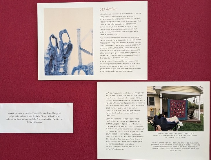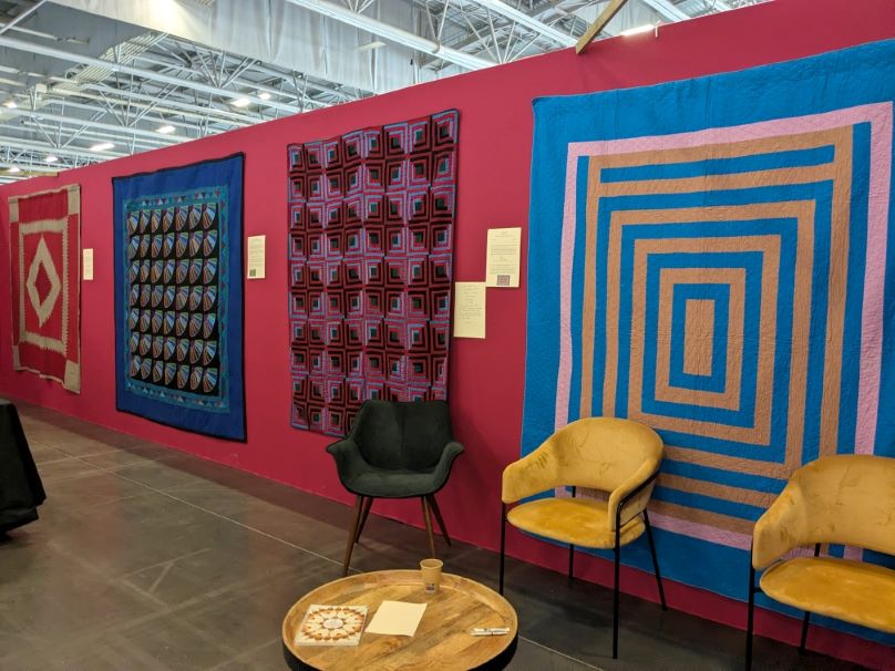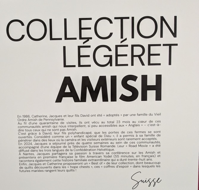 Autres quilts traditionnels oh combien aimés : ceux de la collection de Jacques Légeret, des quilts Amish bien sûr. Je ne raconte plus leur origine tellement les quilteuses de ma génération ont suivi son histoire singulière dès les premières années, mais je me suis surprise à devoir expliquer qui est ce monsieur à plusieurs personnes au Coin des Blogueuses, en raison du film Yodel passé à deux reprises au plateau TV. Depuis le temps que je côtoie Jacques, j’ai une grande admiration pour lui et même de l’affection. J’ai tous ses livres, je les feuillette toujours avec émotion. Et les Amish restent pour moi une énigme, titre d’un de ses livres.