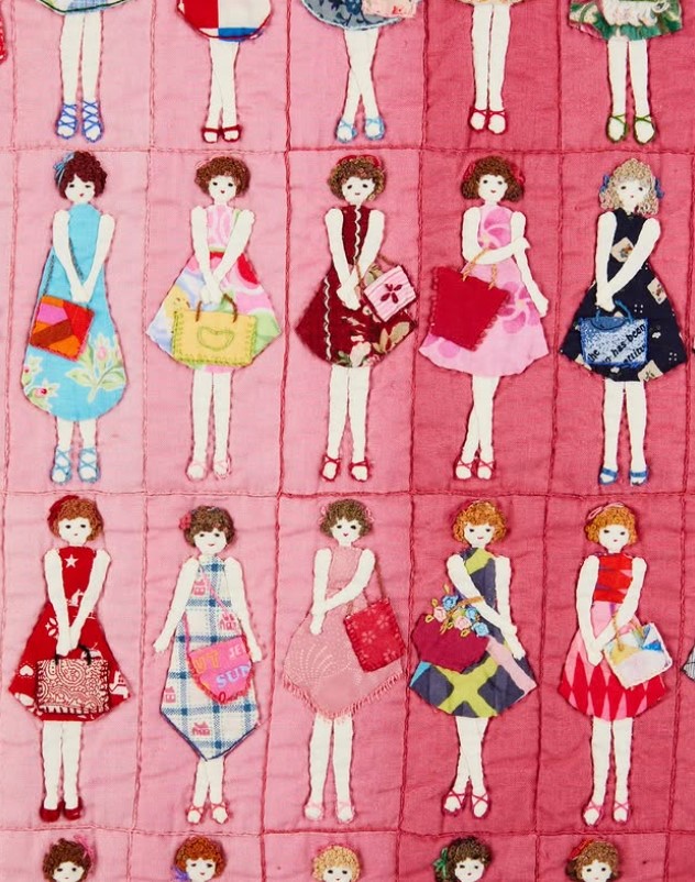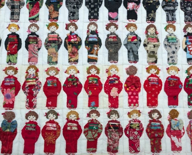 Les quilts aux petites filles en kimono battent des records , aucune n’a la même coiffure ni le même tissu de kimono, elles mesurent 7,5 cm de haut, elles sont, je crois, 1 500… Mes autres photos sont mauvaises, désolée…