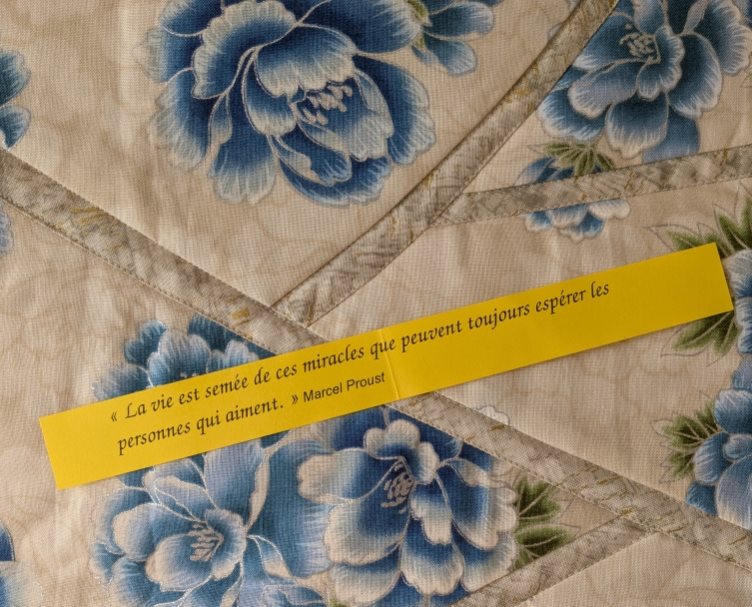 Chaque brodeur et brodeuse reçoit le droit de tirer au sort une citation de Proust. Ah quel délice ! J’ai été choyée par le sort :