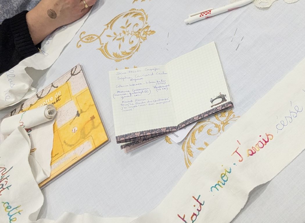 Nous faisons entière confiance à Claudine qui mettra prochainement en scène ces phrases brodées avec amour. Et je peux vous affirmer que chacun gardera en mémoire ce moment privilégié, les échanges avec Claudine et son amie Cécile, cette participation amusante… Quelle bonne idée !