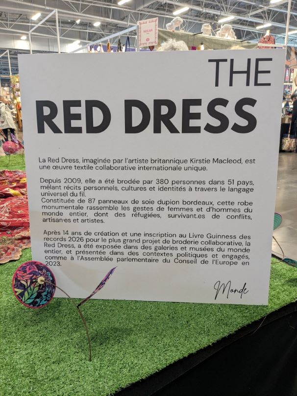 A l’entrée, une robe exceptionnelle nous accueille ; une robe rouge mercredi et jeudi, une robe thé vendredi et samedi. Cette année, des panneaux reprennent en grand les textes disponibles sur le site. C’est beau, c’est informatif, on peut aussi les photographier pour lire plus tard. Je prends donc le parti de vous laisser lire les explications (cliquez sur la photo pour agrandir), car je ne le ferais pas mieux ! Les 2 photos de détails sont de Dominique.