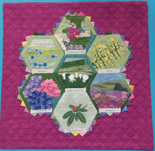 Et nous avions fait chacune (Joëlle, Laurence, Anne, Monique, Karine, Myriam et moi), à l’initiative de Laurence, un hexagone dans lequel se trouve une fleur emblématique de la Bretagne. Les étiquettes brodées sont de Joëlle. Laurence s’est chargée de les composer ensemble et d’en faire un quilt spectaculaire :