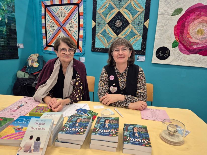 L’équipe des Petites Mains d’Isaure a été constituée par Joëlle, avec sa grande amie Anne et Laurence, la cousine d’Anne que je connaissais déjà, avec ses coups de cœur lors de ses séances de dédicaces à Nantes l’année dernière (Myriam et Monique), avec Karine avec qui Joëlle a eu de longues conversations littéraires et amicales… La vie, tout simplement ! Smaranda s’est ajoutée à notre groupe plus tard, et nous a offert cette splendide couverture, ainsi que le quilt évoquant le tome 1. Et voilà !