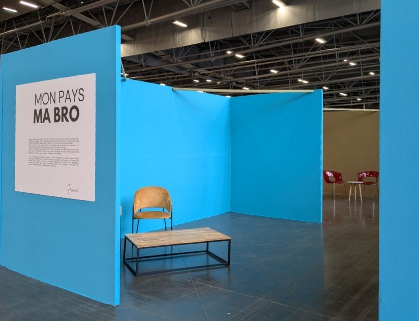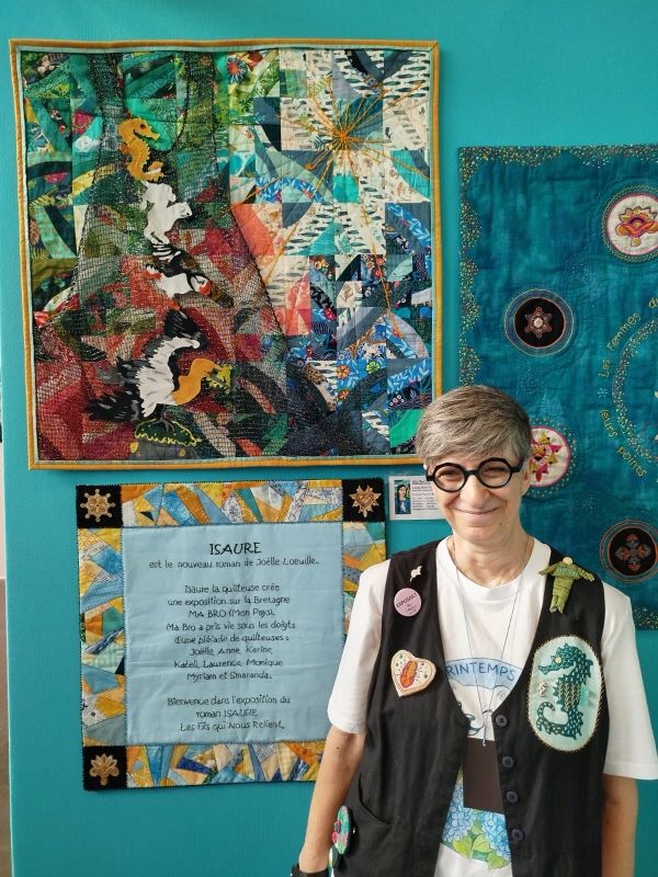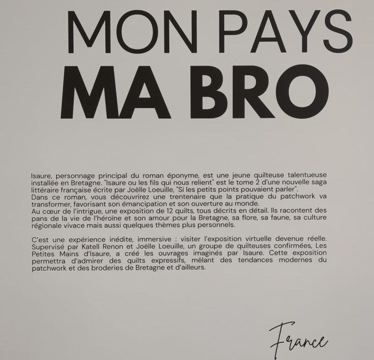 Une exposition de Pour l’Amour du Fil 2026 me tenait particulièrement à cœur, celle qui m’a fait travailler, rêver, douter, rire ces derniers mois, c’est Ma Bro (Mon Pays, en breton). Tandis que Joëlle Loeuille écrivait le tome 2 de Patchworks présenté l’année dernière en ce même lieu, nous étions sept quilteuses à faire de notre mieux pour illustrer un épisode de la vie de la nouvelle protagoniste, Isaure. Les conversations fusaient dans notre groupe WhatsApp, de jour comme de nuit, même à Noël !