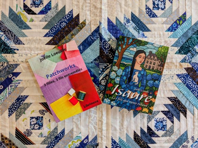 Seulement, ce n’était pas du tout ce qu’avait imaginé Joëlle… Tout ce premier jour d’accrochage, je la sentais tendue. Je peux vous assurer que Joëlle a fait son Isaure ! Avec une incroyable ressemblance avec le premier chapitre du roman, Joëlle s’inquiétait de la nuance du bleu des murs. J’ai même cru un instant qu’elle nous faisait une blague, mais je la voyais sincèrement perturbée, alors que moi, je constatais, en déballant les quilts, à quel point chacun serait mis en valeur par ce bleu dynamique. Je faisais peut-être ma Claudine ou ma Sophie ! Lisez Isaure…