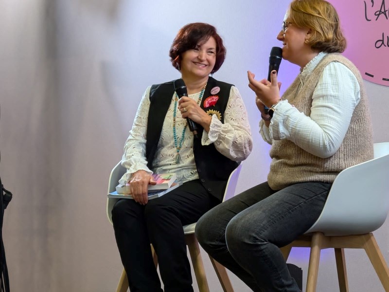 En tant que Madame Sous, Monique assistait bien souvent Joëlle qui dédicaçait ses livres, avec toujours un mot gentil, un intérêt authentique pour chaque visiteur. Et moi je papillonnais, je faisais en particulier les remplacements pendant le déjeuner, et plusieurs visiteuses se désolaient que je ne sois pas Joëlle en personne 😉. Nous gardons un souvenir ému de cette semaine ensemble et avec vous tous. À vrai dire, nous avons du mal à redescendre de notre joli petit nuage !