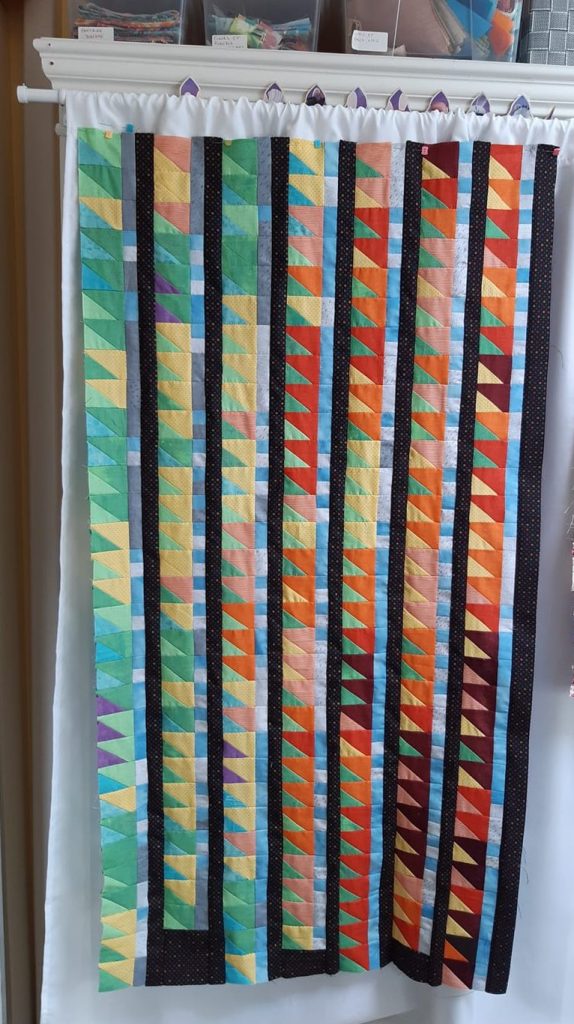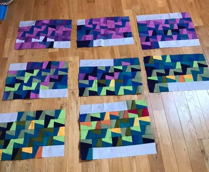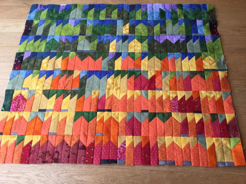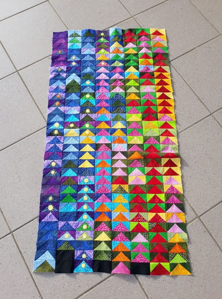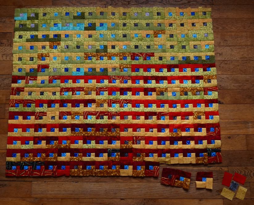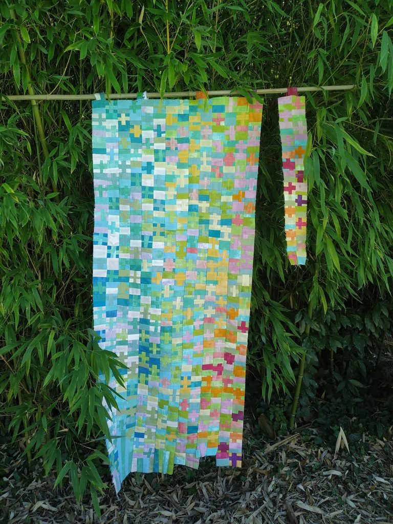 Le Kintsugi devient aussi des lignes cassant un bloc, avec les inserts de bandes assemblant le patchwork :