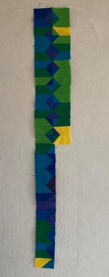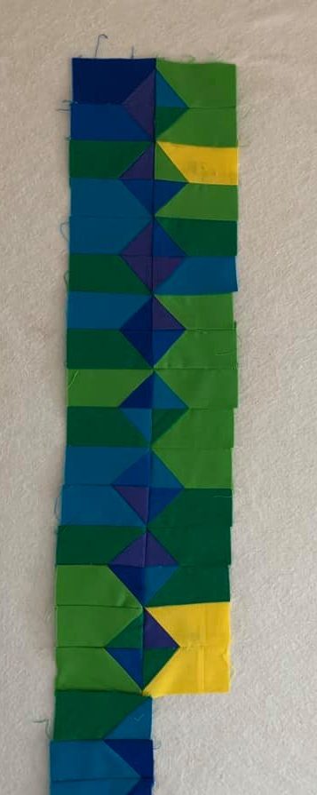 Pour soutenir les efforts des quilteuses créatrices que j’aime, j’achète régulièrement des modèles, même si je devine bien souvent comment faire ! J’ai donc acquis ce PDF et commencé à faire quelques blocs. C’est un grand amusement… qui prend tout de même beaucoup de temps ! Pour aller plus vite, il est judicieux de préparer plusieurs troncs à la fois, avec de larges bandes cousues les unes au-dessus des autres puis redécoupées dans l’autre sens. Je vous montrerai ma forêt une fois terminée !