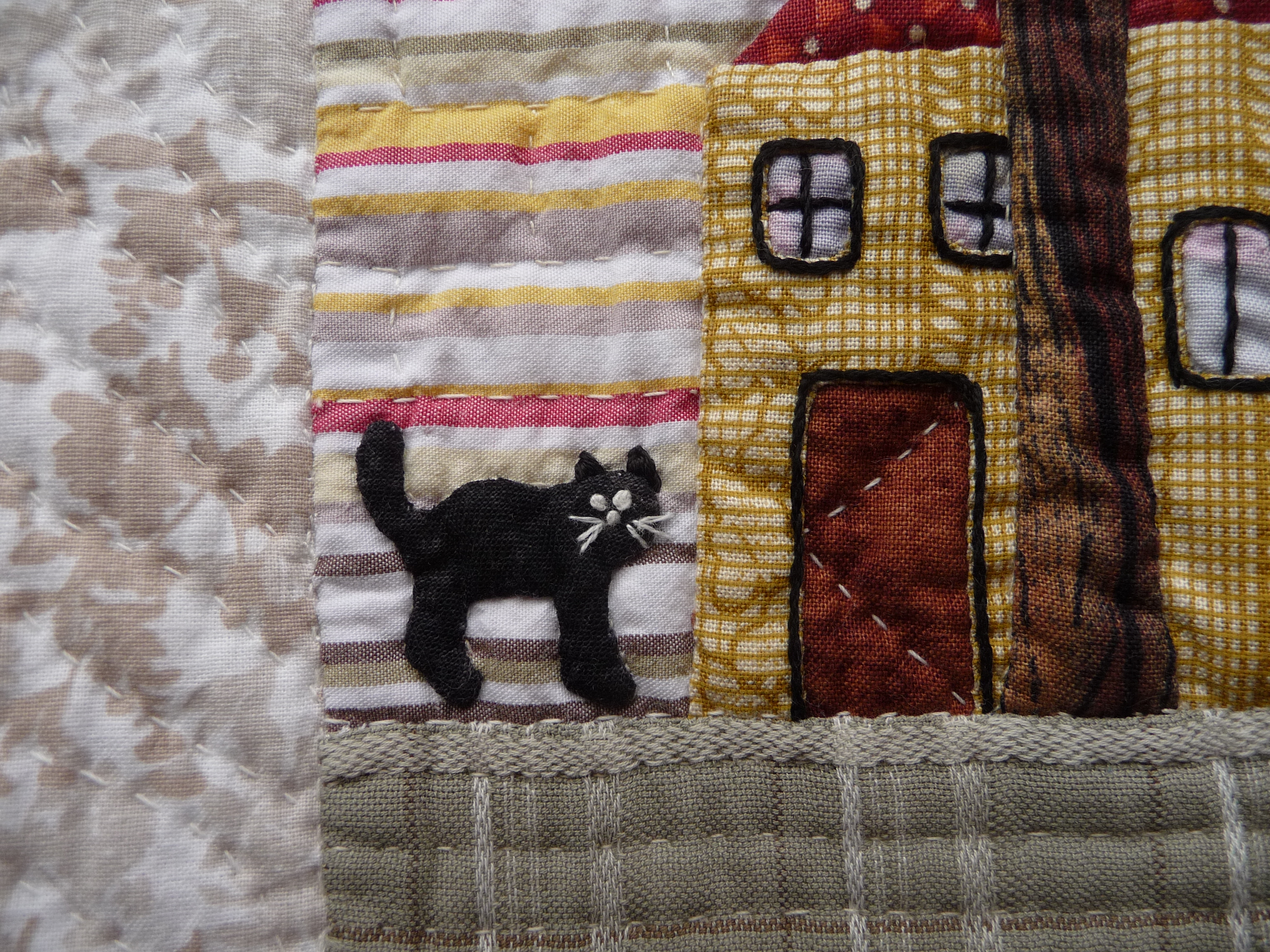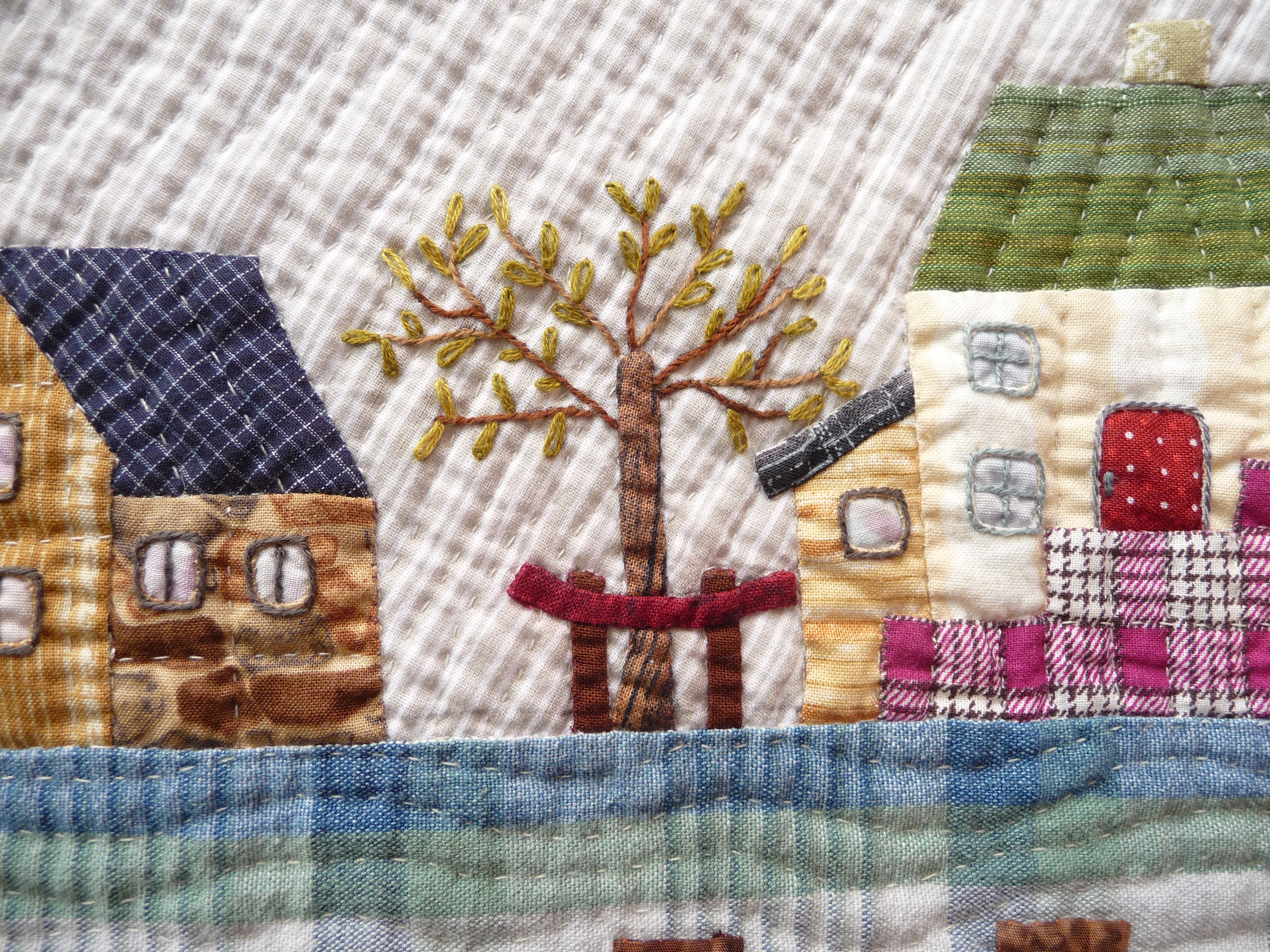 Annie aimant les couleurs vives, elle n’a pas hésité à utiliser de nombreux tissus de récupération, des bouts de vêtements, des restes d’autres ouvrages, pour en faire un village où il fait si bon se promener… J’ai remarqué à quel point les rayures et les écossais conviennent aux maisons, ils évoquent des colombages, les croisillons de fenêtres, les ombres rectilignes…