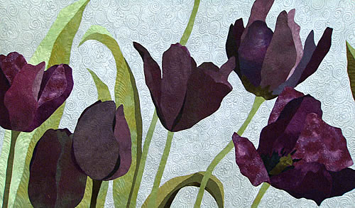 La fleur de tulipe, si ronde et élancée, se plie facilement à toutes les interprétations textiles ; piécées ou appliquées, elles se prêtent à tous les jeux. Entrons donc dans la danse des tulipes…