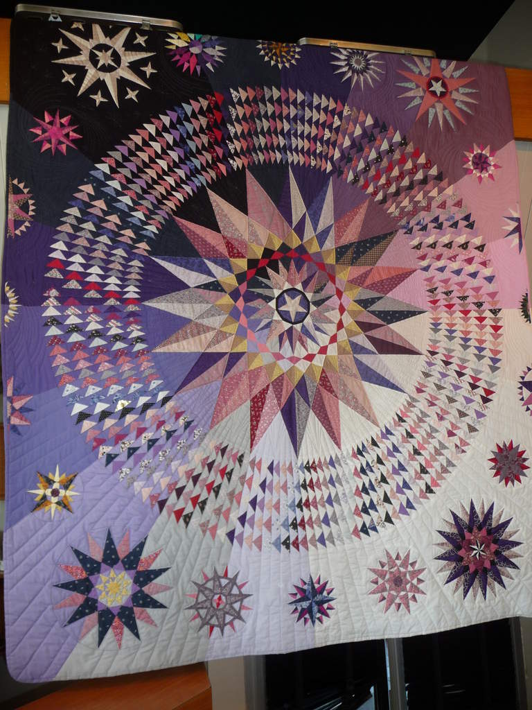 Extraordinaire quilt de notre amie Any Vieussens, ayant nécessité des milliers d’heures de travail tout à la main ! Modèle américain magistralement interprété évoquant de longs voyages entre ciel et mer…
