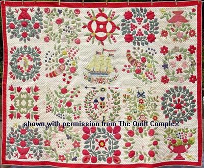 Il est amusant de voir tant de blocs de fleurs encadrer quelques blocs plus symboliques (voilier, personnage, la Bible…). Ce quilt est au Musée de la Marine en Virginie. Description détaillée de ce quilt ici !Quilt de 1845 environSi vous comprenez l’anglais, un excellent article sur les quilts Baltimore est disponible ici.« Pride of Baltimore », quilt contemporain de Barbara Burnham (2011). Cette spécialiste du Baltimore vient d’exposer et donner des cours pendant le Salon de Paducah.