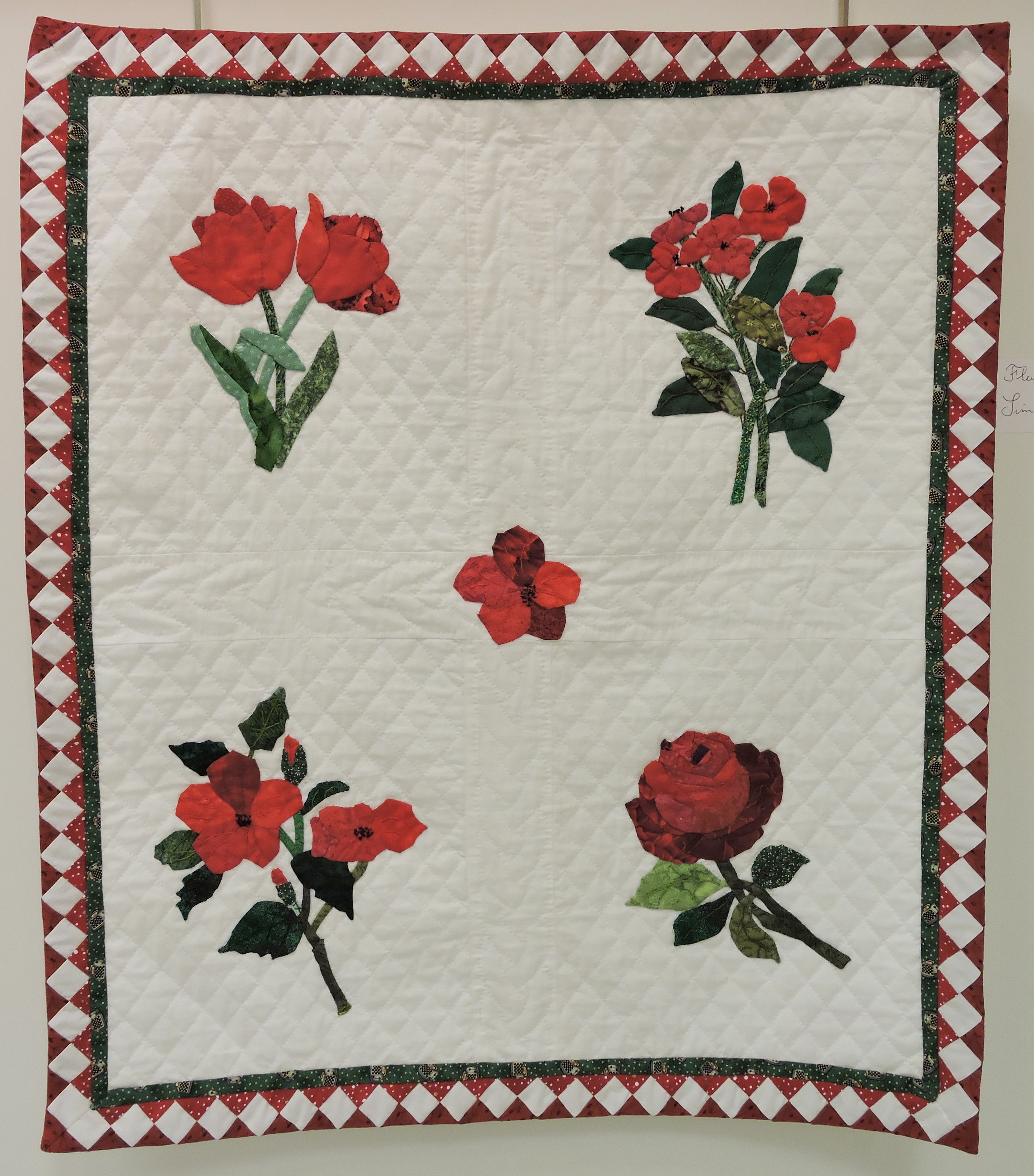 Les quilts de style Baltimore ont souvent des tulipes. Réminiscence du pays d’origine de tant de personnes de ce coin des Etats-Unis ? Très certainement ! Barbara Brackman a répertorié un nombre impressionnant de blocs aux tulipes dans son encyclopédie des blocs appliqués.