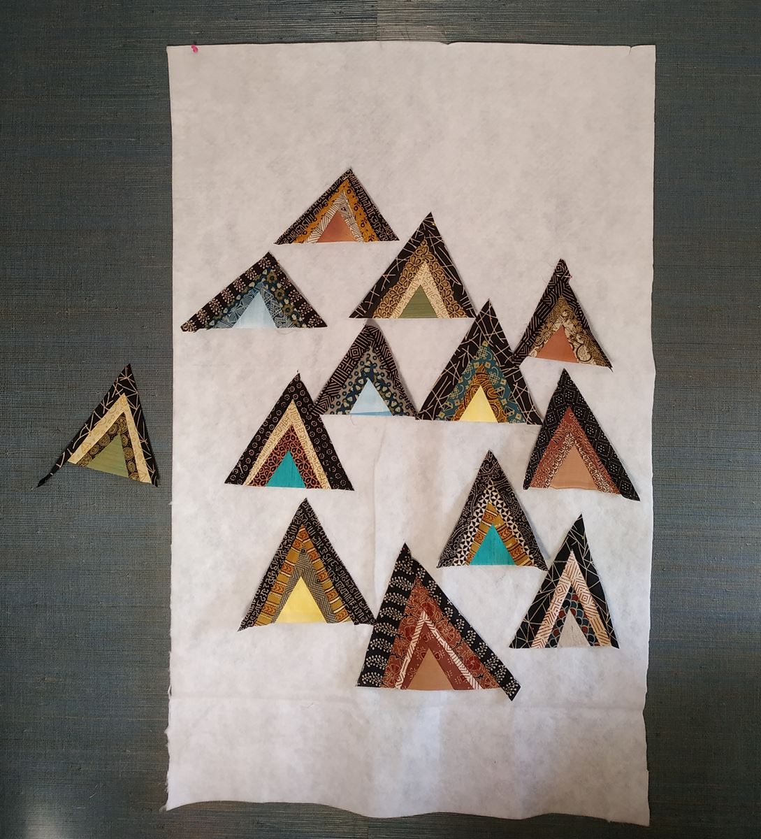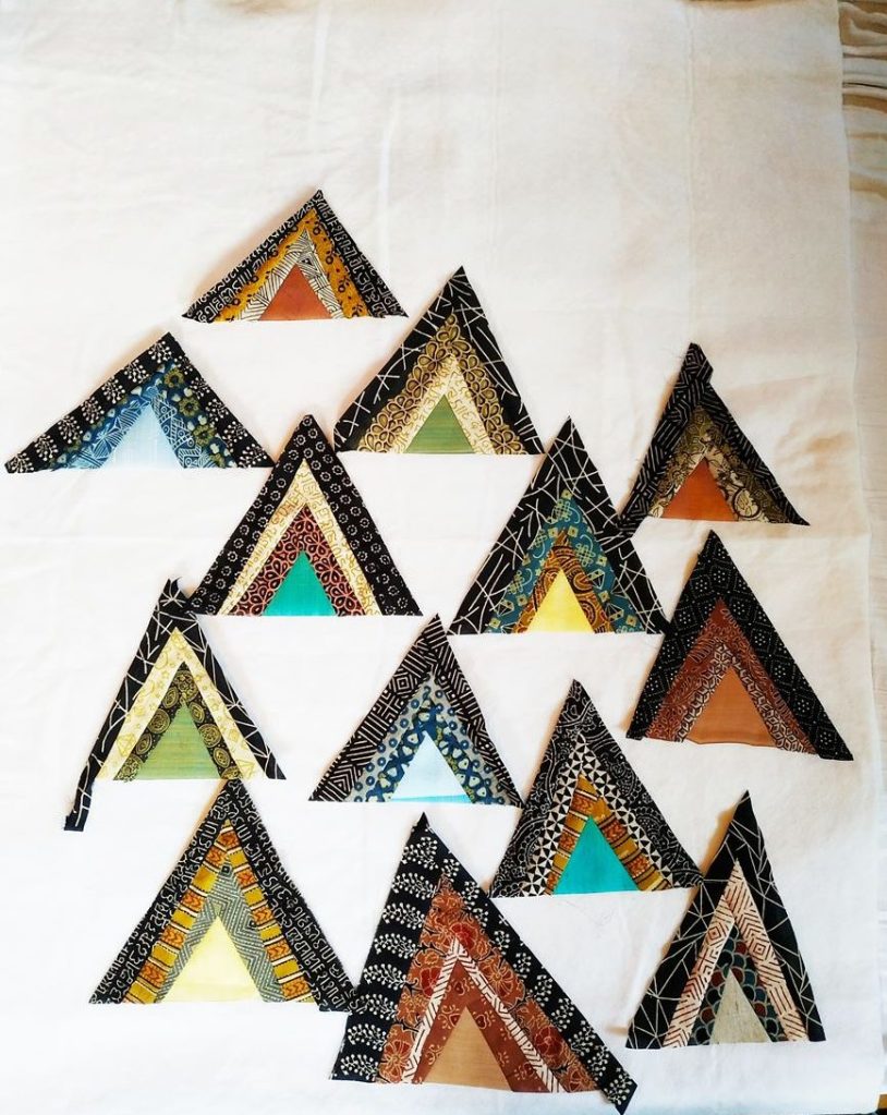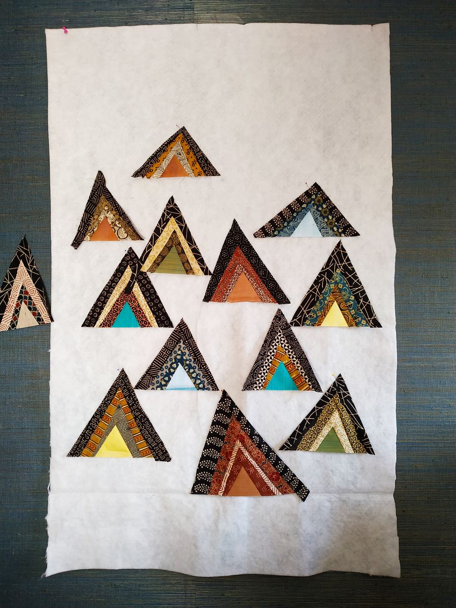Ma disposition est bien irrégulière, comme le sont ces tipis… Vais-je encadrer chaque tipi de tissu noir pour arriver à des rectangles comme Nicholas Ball ? Vais-je les mettre en rangées comme un quilt du livre de Gwen Marston ? Les tipis virevoltent pour trouver leur place et le placement est trop irrégulier pour suivre le montage de Nicholas (ajouter du tissu de fond pour que chaque tipi soit dans un rectangle) et j’ai envie de conserver le chevauchement des rangées. Il va donc falloir innover !