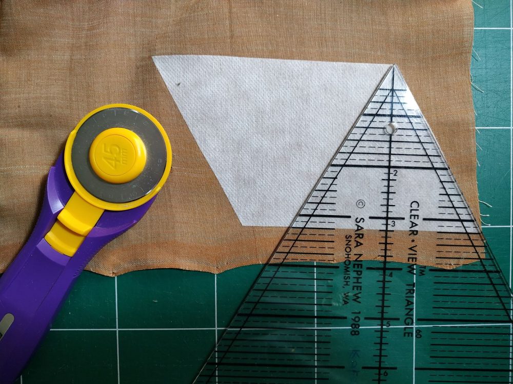 D’habitude, je n’entoile pas les tissus de coton Neelam, contrairement à beaucoup de monde (y compris Émilie pour ses panneaux muraux). L’entoilage facilite le maintien des tissus. En général, je me contente du repassage et, éventuellement, de ma bombe d’amidon. A chacun ses préférences ! Cependant, la soie s’effiloche facilement, je passe donc par cette étape avec un thermocollant non tissé blanc pour tissus légers, de quoi découper 2 triangles par couleur. Mon projet est de faire 12 ou 13 triangles pour en sélectionner 10, pour les 10 ans.