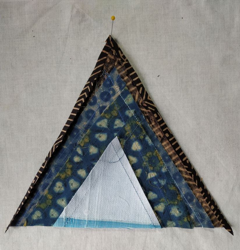 Commençons par la coupe de quelques triangles de soie renforcés au thermocollant, puis cousons un « toit » avec des bandes de coton. J’ose, j’avance et on verra bien !