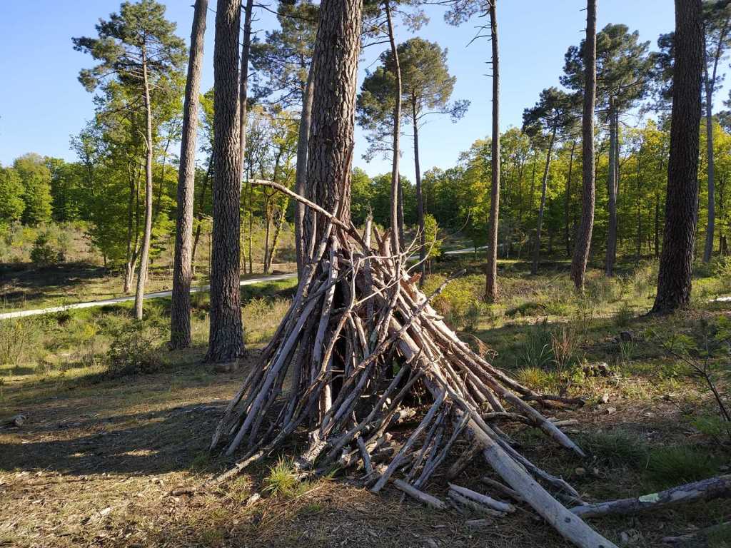 Dans la forêt près de chez moi, certains endroits sont toujours enchanteurs, quelques sentiers sont, en ce moment, bordés de genêts et d’asphodèles. Ici, la biodiversité s’éloigne mais on s’amuse quand même, on fait des cabanes !