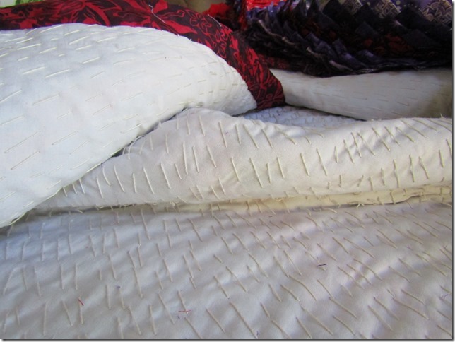 Une fois le top fait… il faut quilter, ce que je ne fais jamais pour un Pine cone ! J’ai encore cherché sur internet, je me suis inspirée des quilts afro-américains que j’ai dans ma collection… Les points de quilting seront en fil rouge, ce qui va bien avec le top d’une part, et qui a une signification particulière pour Rachaeldaisy que je finirai bien par rencontrer un jour (notre Journée organisée par Jen, du Red Thread Studio, a été reportée, toujours en raison de Mr. Corona).