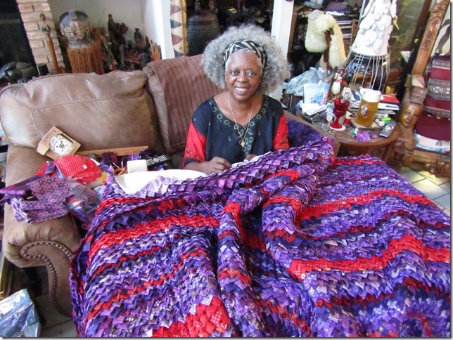 Ce quilt rejoindra donc la collection d’une artiste qui a déjà acheté un Pine Cone quilt à Betty (le vert). Cette femme est spécialisée dans l’expression artistique textile des afro-américaines et elle apprécie le travail extraordinaire de Betty à sa juste valeur. Vous pouvez voir ici la biographie de Dr. Carolyn Mazloomi et les 12 livres qu’elles a écrits par ici. Sans avoir la moindre idée de l’auteure, j’avais présenté un de ses livres par ici, je l’avais acheté, lu et bien apprécié, puis offert à une amie… Un livre très riche et documenté.