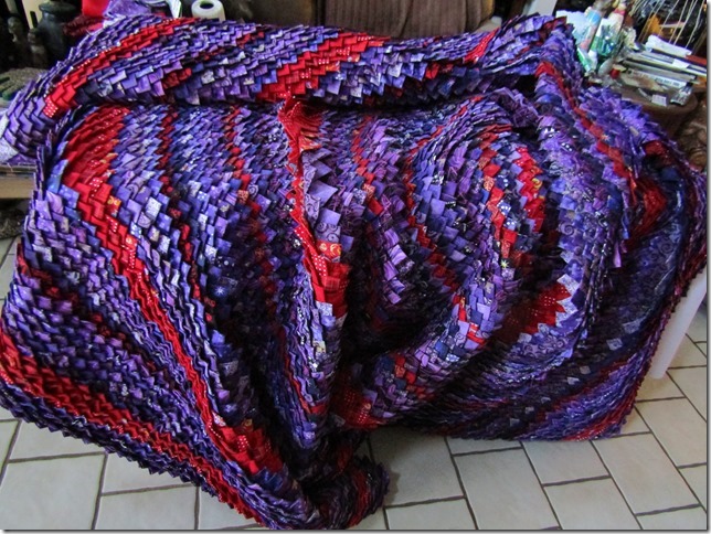 C’était en décembre : Betty m’écrit qu’enfin, son Corona 2020 était fini ! Je lui ai demandé de ne pas oublier de le mesurer et le peser avant l’envoi. C’est chose faite, ce nouveau « bébé » mesure 260 x 265 cm et pèse… 23,5 kg !!