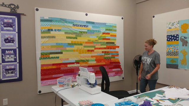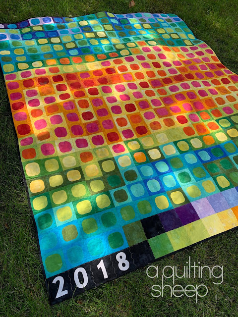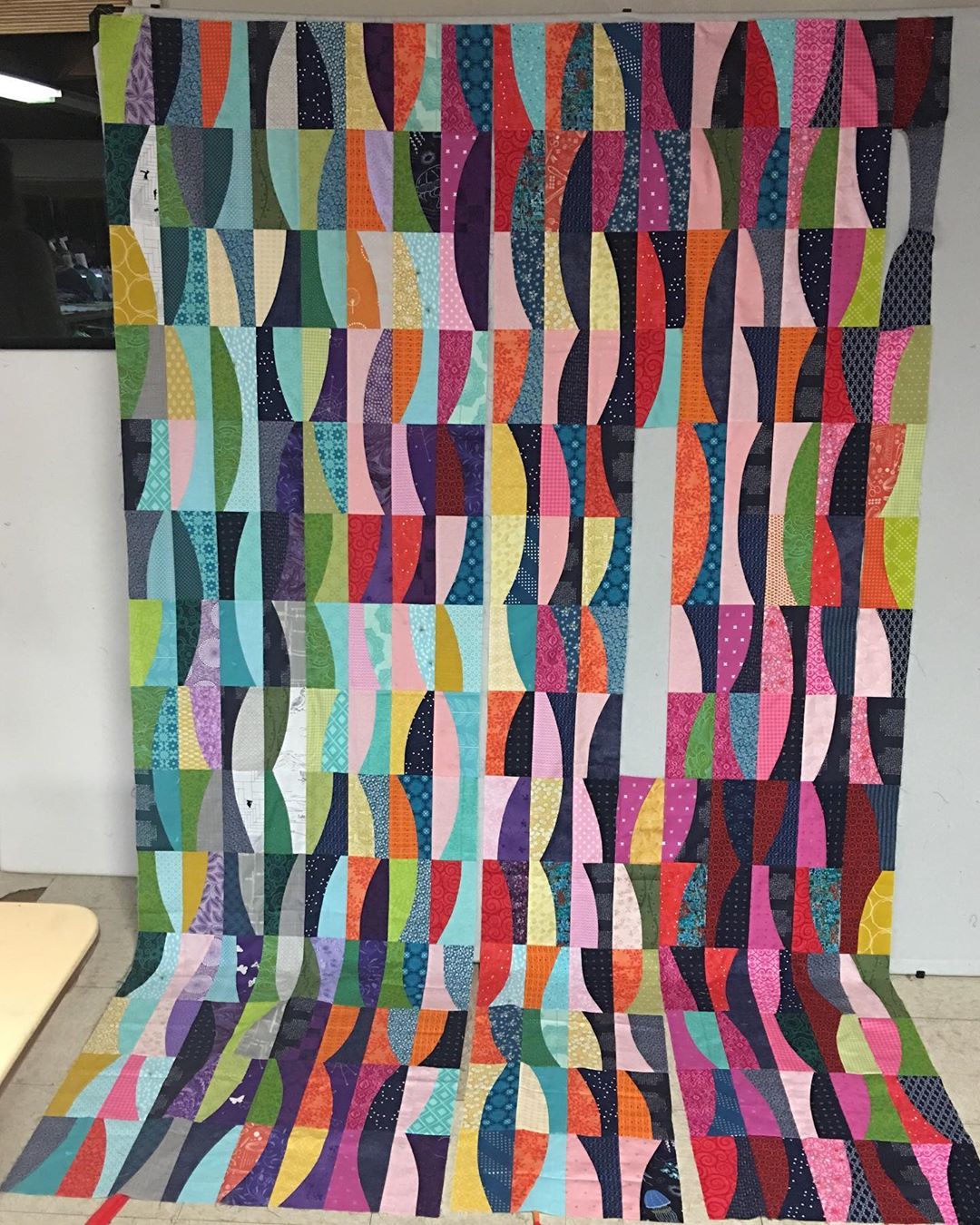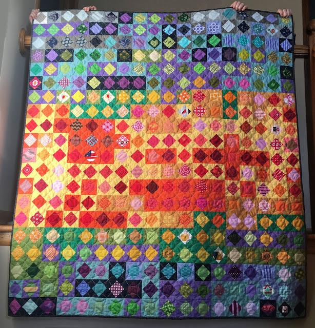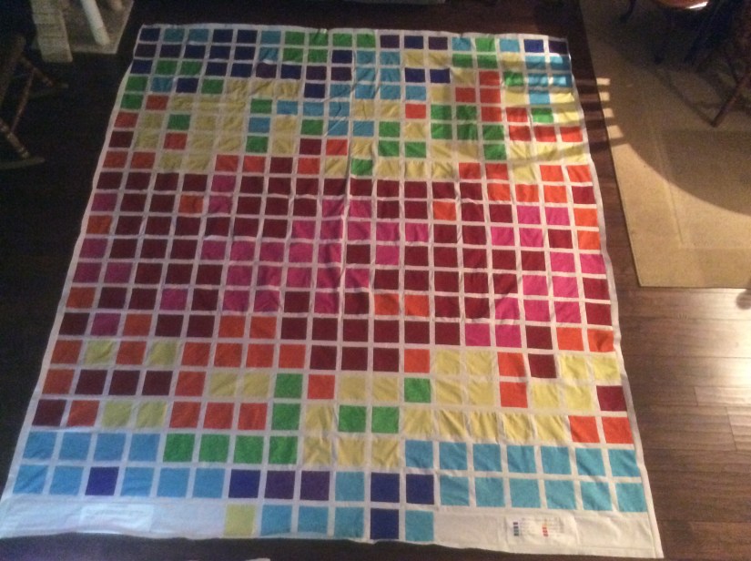 Ce quilt est fini depuis belle lurette lui aussi… à part la bordure de finition qui a traîné ! J’avais partagé quelques détails au fur et à mesure sur ce blog. Chaque couleur m’inspira une ambiance, un mot, dans diverses langues. Ainsi, mon séjour récent en Espagne m’avait inspiré les mots Luz (lumière) et Vida (vie). Quelques incongrus avec le mot chinois qui signifie crise, le mot breton Glaz… Beaucoup de spontanéité dans ce quilt de chutes de tissus (je ne sais pas ce qui se passe dans mes tiroirs, ils semblent se reproduire, j’en ai toujours autant !…)