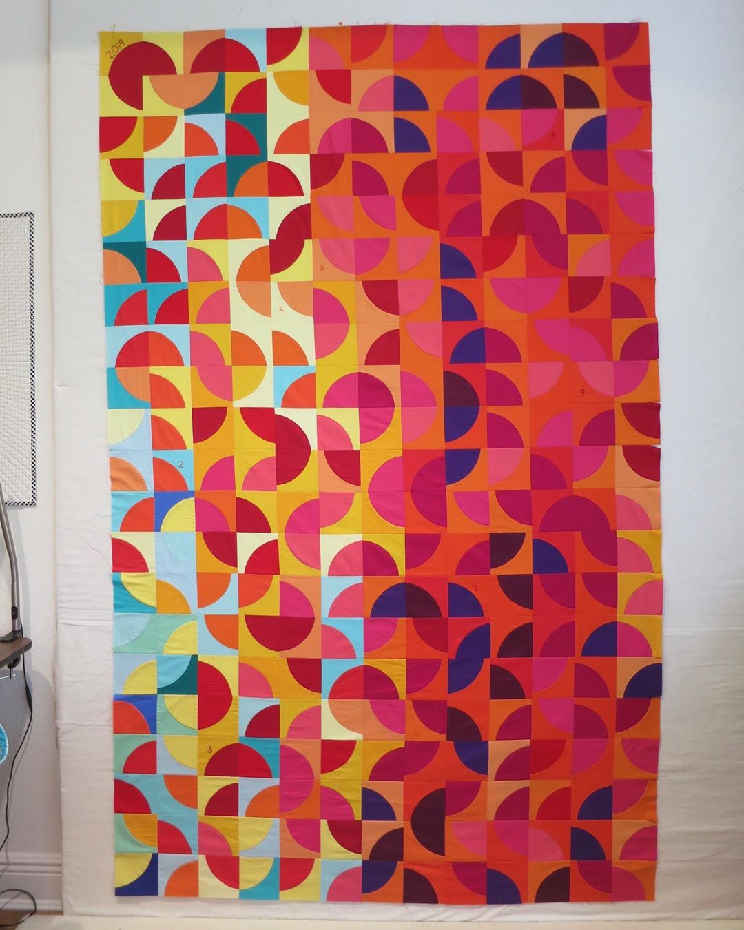 Fin octobre 2015, sur un autre blog, je tombe sur un projet de réalisation sur 1 année avec 1 bloc par jour : appliquer sur 1 carré, 1 rond fait d’1 ou plusieurs morceaux de tissus piochés au hasard dans ses tissus selon l’humeur du jour, à la façon d’un journal intime quotidien. Cette idée d’1 bloc par jour me plait bien, mais le rond sur le carré beaucoup moins ! A titre d’exemple, vous pouvez voir