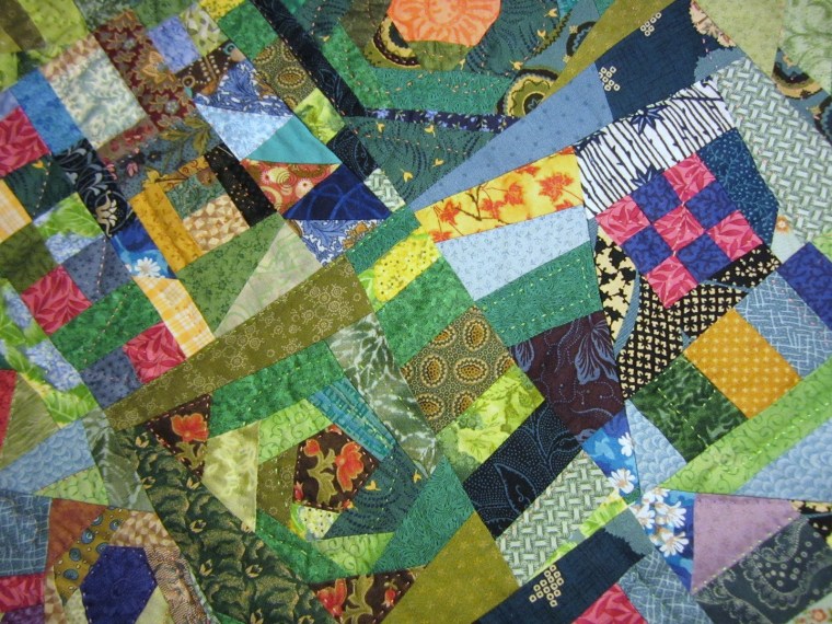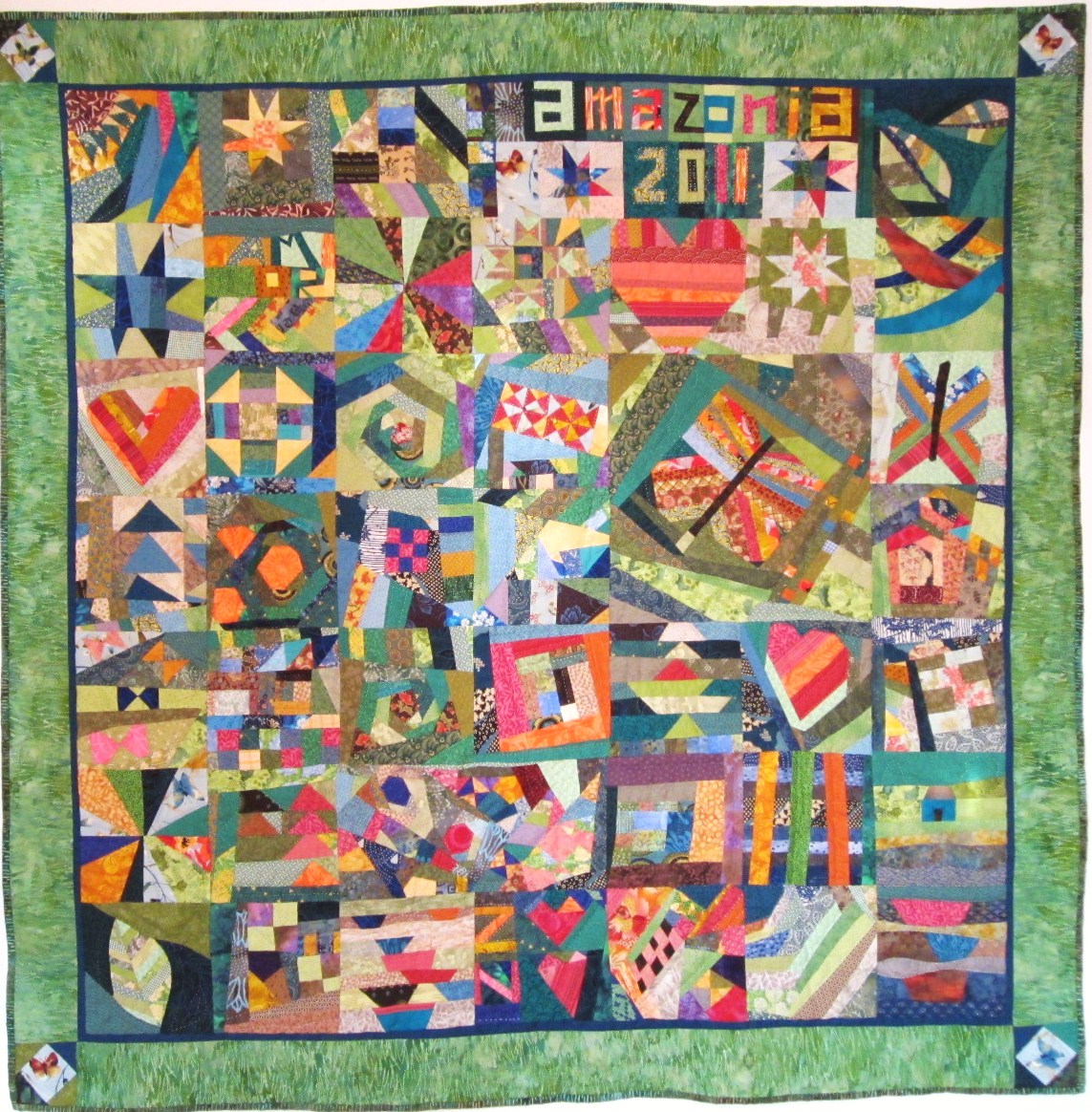 « Amazonia », quilt déstructuré fait en m’inspirant des photos de ma fille alors en Amazonie, tout en suivant le « quilt along » organisé par Jo’s Country Junction en automne 2011.