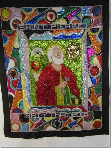 Au-delà des couleurs et de la signification religieuse derrière les images, ce sont les bordures décoratives qui attirèrent mon regard parce qu’ils me rappelaient les quilts des USA. Les perles et sequins sont cousus sur du coton ou de la récupération de sacs texturés en plastique ayant contenu du riz ou des haricots, puis doublés de beau satin, encadrant le tableau d’un surplus de brillance. Chaque scène est faite de perles et sequins fixés à la main avec du fil et une aiguille, l’un après l’autre ; de une à quatre personnes peuvent y travailler en même temps.
