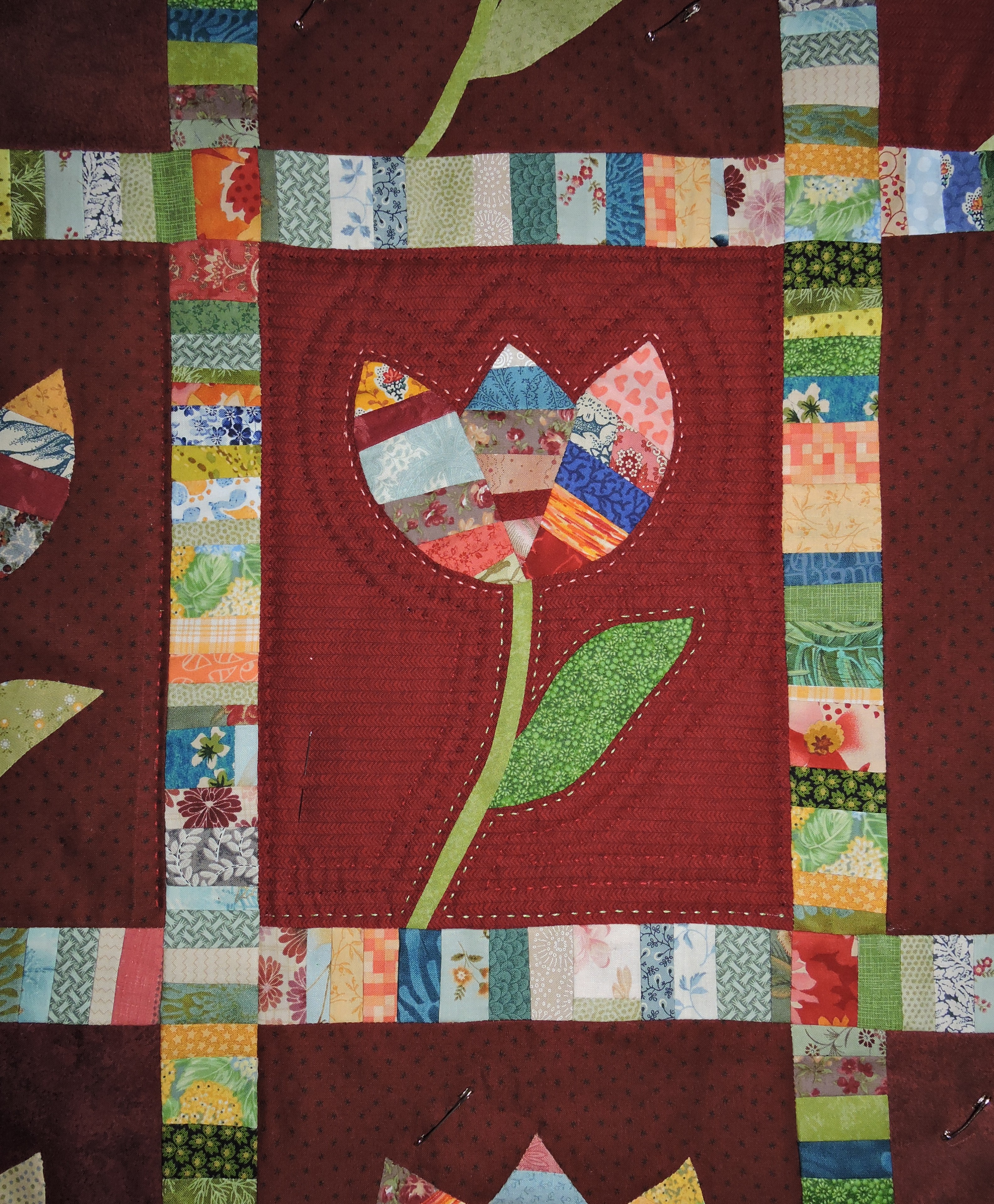 En cours de matelassage, tout en coton perlé ! J’ai fait le tour des tulipes en vert côté tige et feuille et d’une autre couleur autour de la tulipe, puis le fond est quilté de diverses façons, en rouge foncé dégradé.