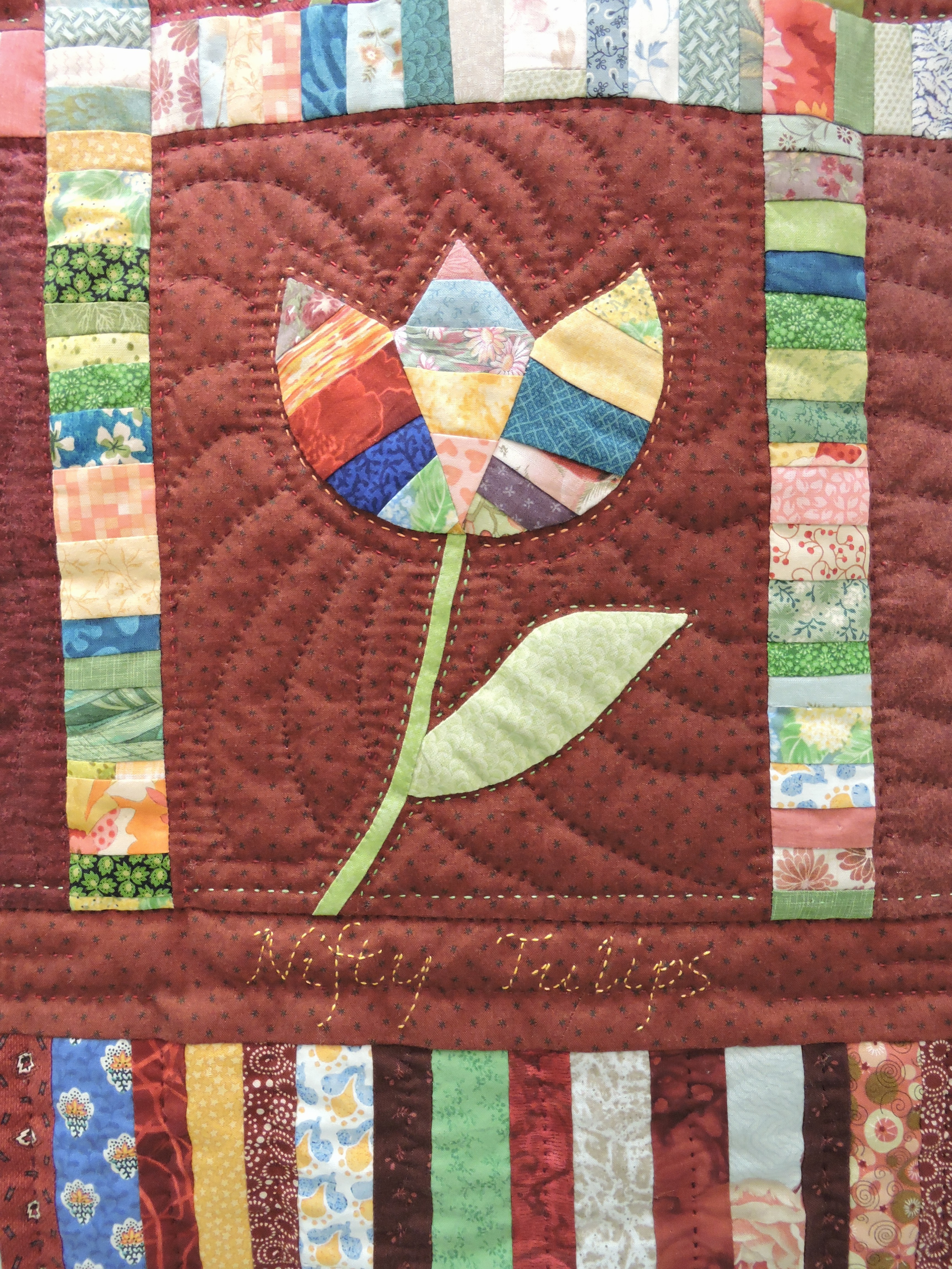 Depuis, de nombreuses tulipes piécées ont vu le jour, parmi lesquelles mes toutes récentes Nifty Tulips. Elles s’appellent ainsi bien sûr pour rappeler que sans LeeAnn, je n’aurais peut-être jamais connu ce quilt qui m’a inspirée à mon tour. Et puis on peut traduire cela par « de chouettes tulipes », ce qui me va très bien ! Si vous souhaitez en chercher d’autres sur internet, tapez « string tulips » (tulipes de bandes).
