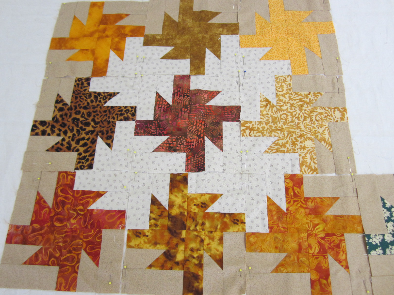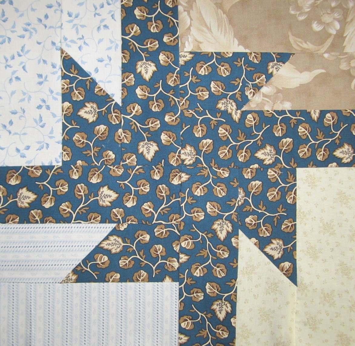 * Les moulins centraux sont d’une couleur qui variera d’un bloc à l’autre, le tissu de fond reste le même. C’est l’idée du modèle de QM, qui a raffiné son quilt avec un carré central de fond plus clair. Les Abeilles Simone et Christiane l’ont commencé ainsi :